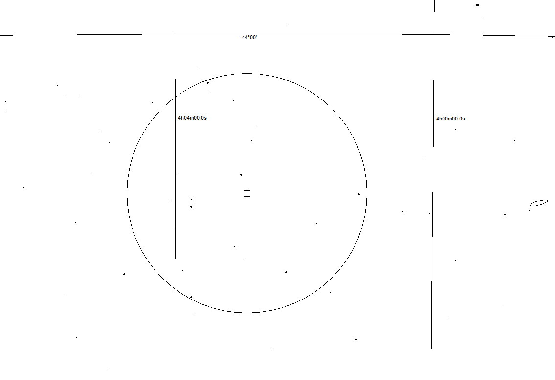 This lies near the centre of a large (40') field of 9 stars brighter than V=9.0. At the approximate centre lies HD 25740 SAO216616 (V=8.12, 04:02:58.4. -44:23:32). In the diagram below, the circle has a diameter of 40', the square indicates Lacaille's position, and north is up and east to the left.