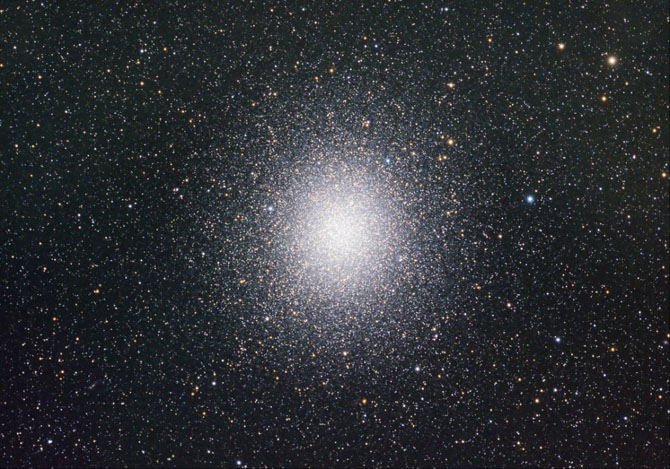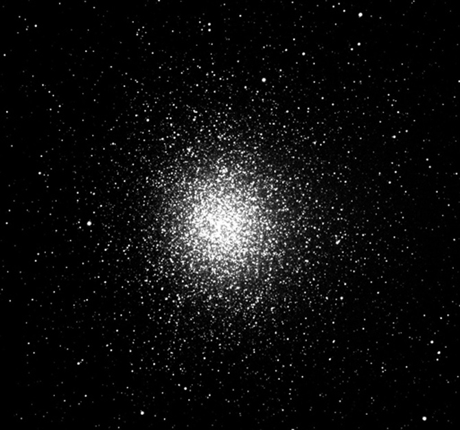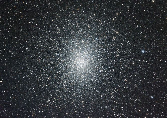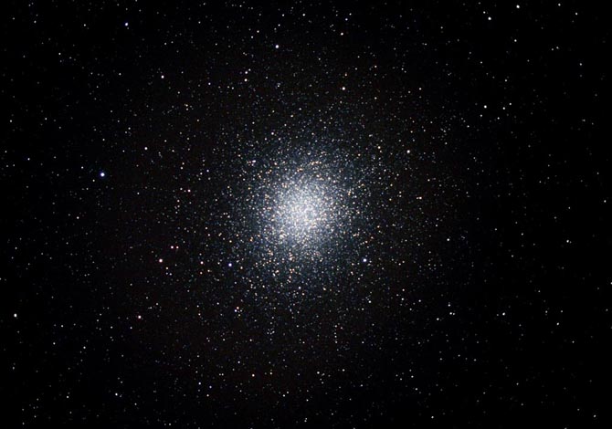 A 15.5-inch reflector at 220x shows this glorious object which fills the field of view with stars. The central disk appears more or less even, whilst with averted vision it is clearly mottled. Look for the brighter knots of stars which surround this central core.