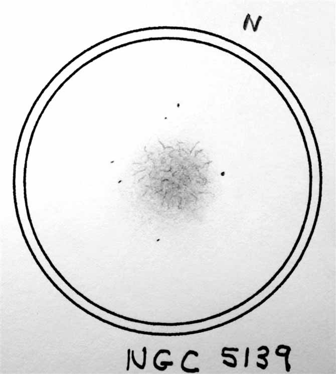 Size=36arcmin, V=3.7. One of the closest known globular clusters at 17 000 light years. Large, bright and visible with the naked eye. Large concentration toward the nucleus M7 10arcmin, the outer halo slightly dimmer at M7.2 5arcmin. NGC 5139 is totally unresolved and stands out well from the background. Few field stars in the vicinity of 8th-9th magnitude. NGC 5139 is easily found and visible through small binoculars.
