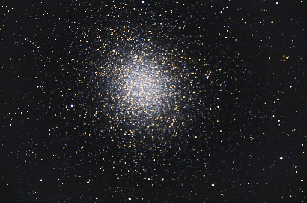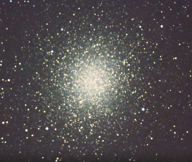 48x: Very large, very bright globular cluster approx 30′ in size. Very spectacular to observe. Very well resolved. Elliptical shape with stars concentrated towards the centre. Stars look like thousands of grains of sand. Averted vision resolves stars in centre better. The core is slightly brighter than the outer region. Brightness gradually fades to edges. Approx 80 stars of varied brightness can easily be counted in the outer region. Thousands of stars are resolved towards the central region which also has a diffuse glow from unresolved stars.