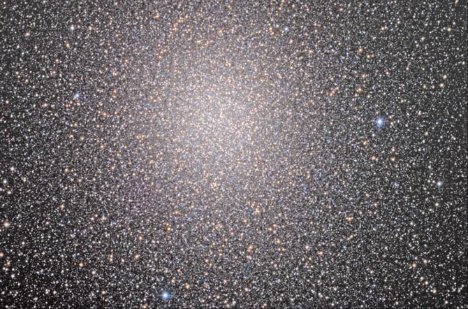 magnificent globular cluster, 31' diam. over denser parts; ... a considerable number of giant stars is visible in this cluster, however, with a moderate aperture.