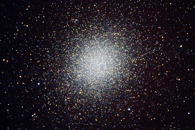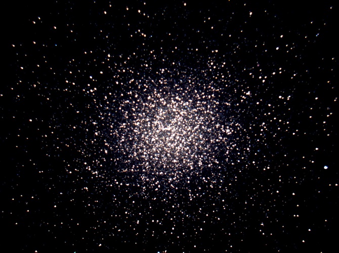 Notes: Large bright globular cluster. Fuzzy ball � denser in the middle. Fuzzy filaments radiating from the nucleus � almost looks like candyfloss. Four bright stars form diamond shape around the cluster. 17mm eyepiece does resolve a few stars.