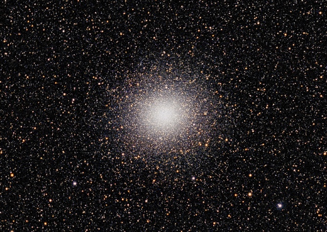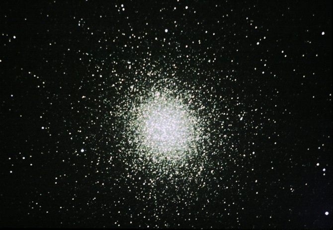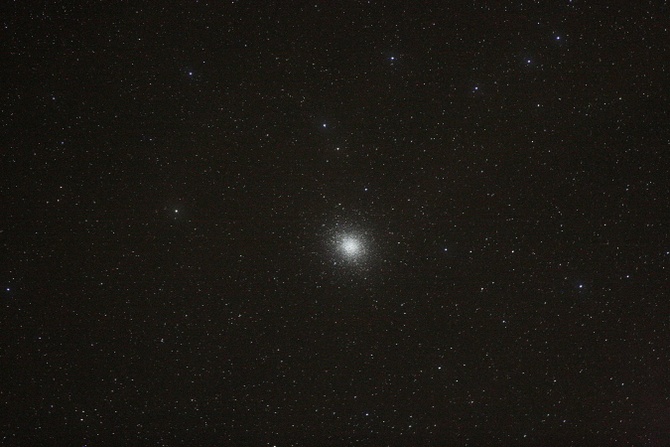 THE most impressive globular cluster of all. Looks like a 3D ball of flickering Xmas lights (white). A few prominent (marker) stars near and in it.